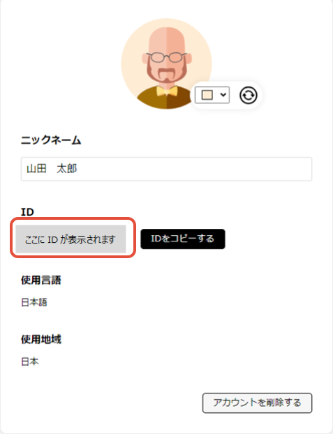 画面右上にあるアイコンをクリックし、プロフィールを開くと自分のIDを確認できます。