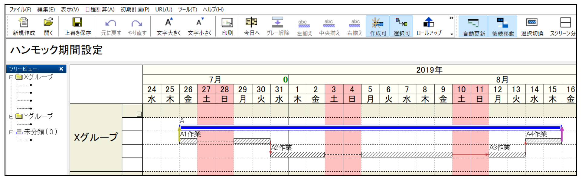 本ツールでは、関連する作業群の全体期間を表現する「ハンモックバー」を設定できます。